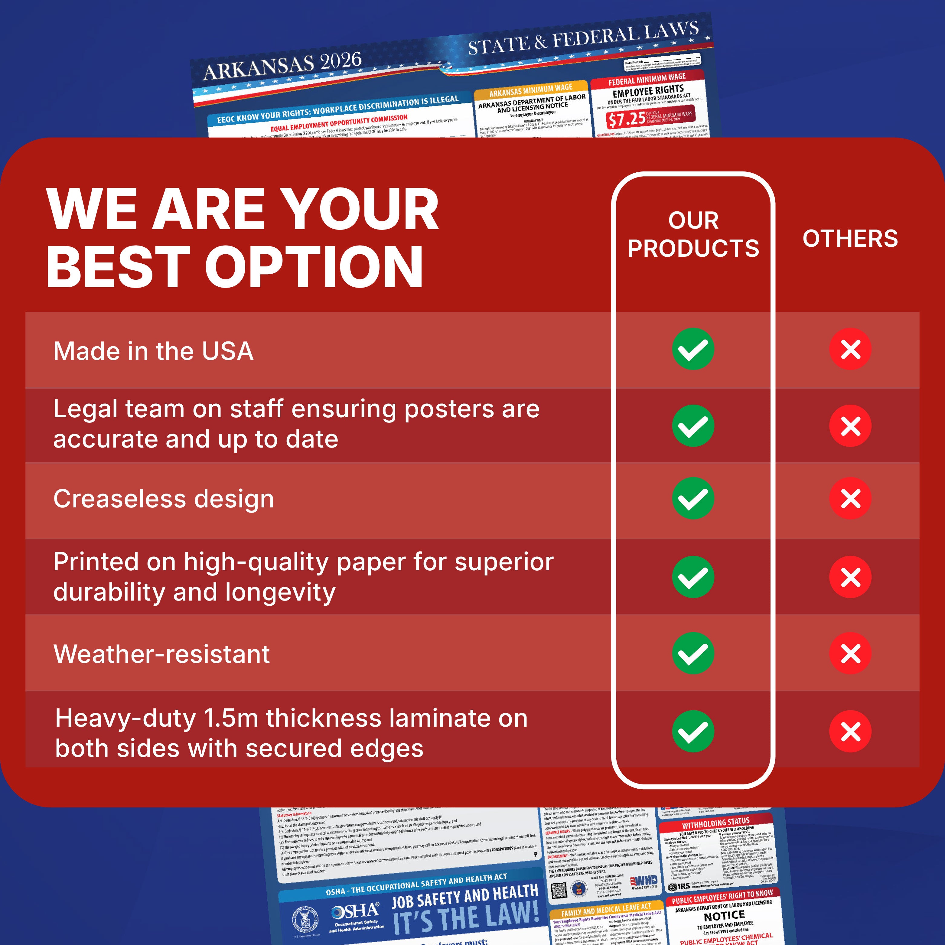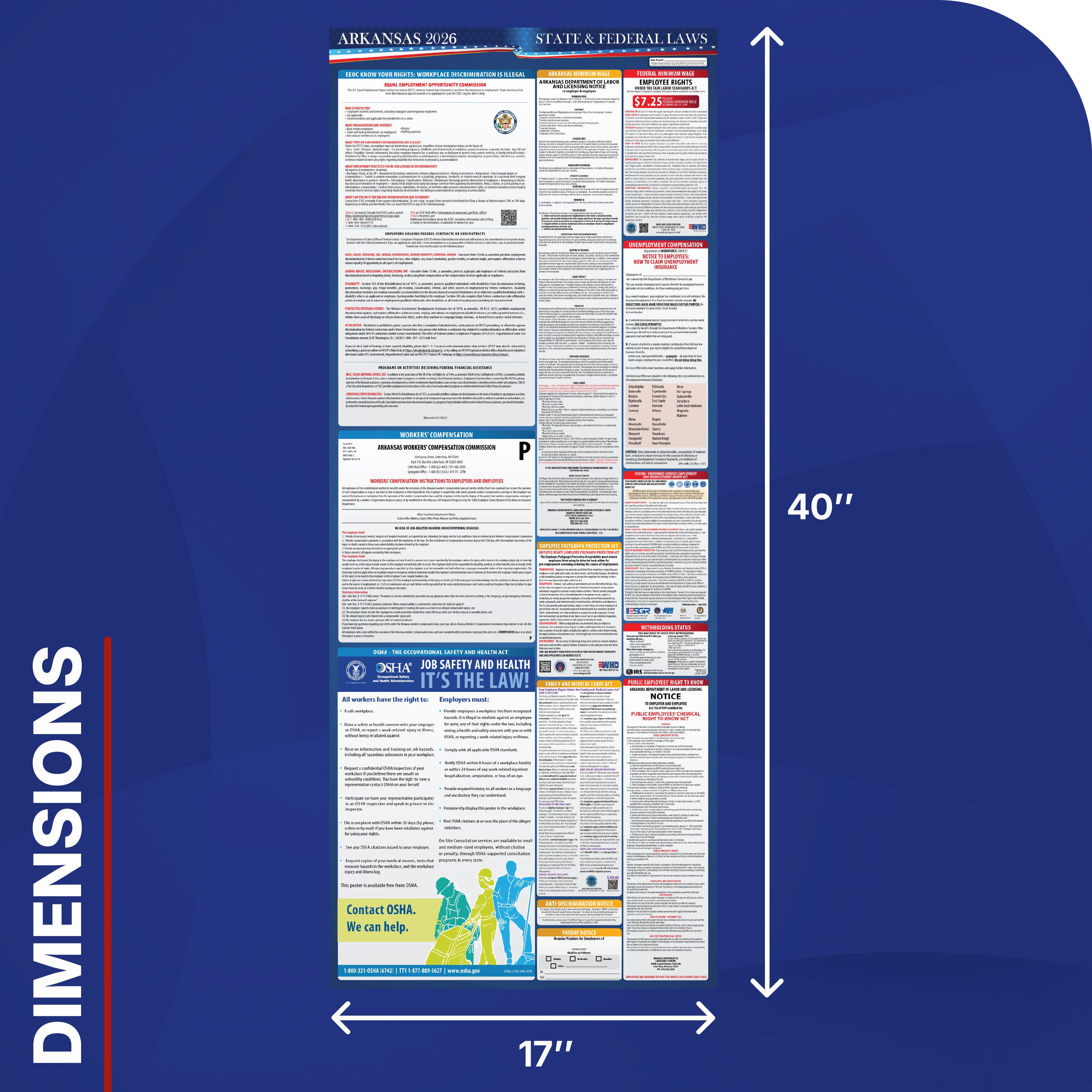 • Combined coverage: One poster meets both Arkansas-state and federal posting requirements.