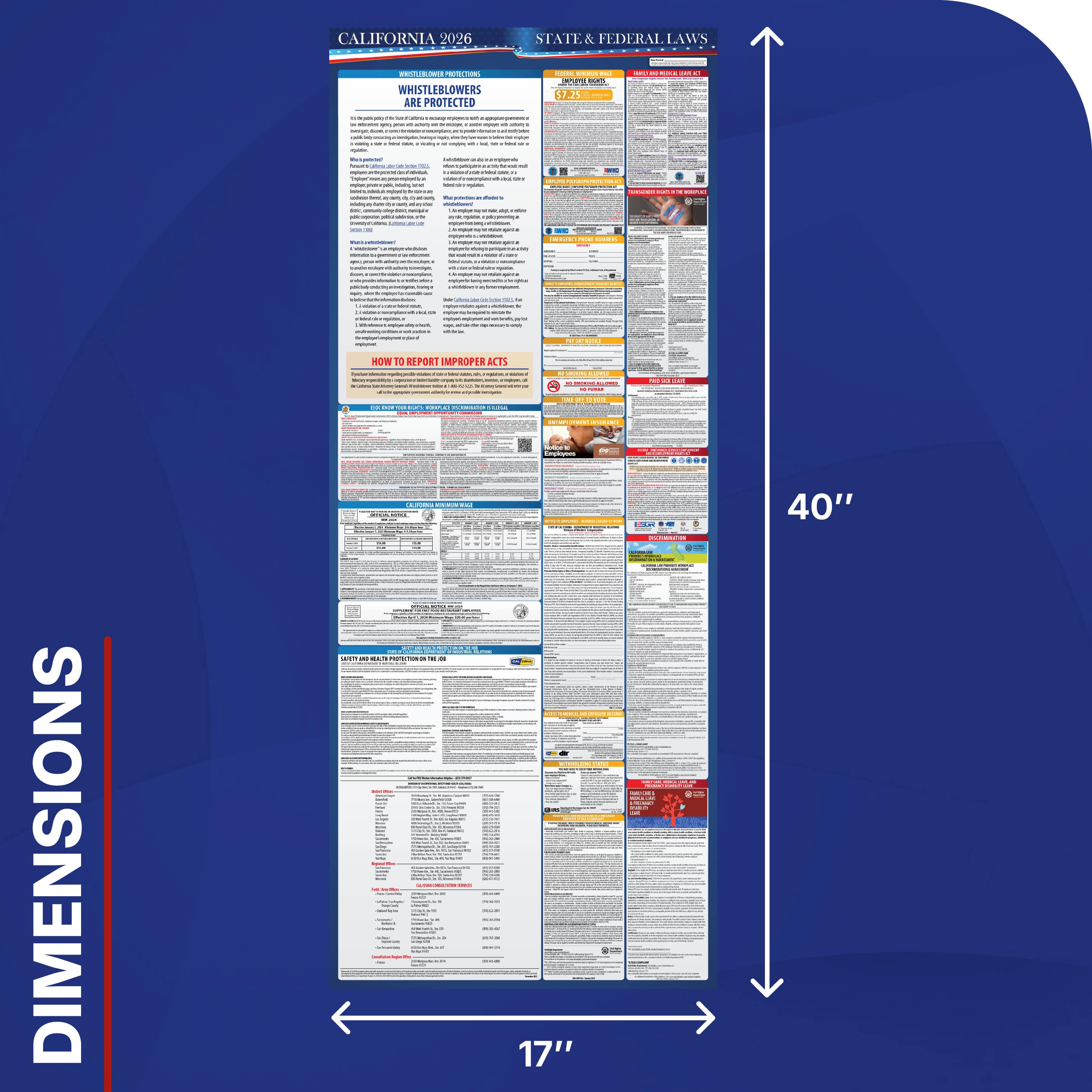 An all-in-one California labor law poster that includes Federal, State, and OSHA-required labor laws printed on a 16x40" double-laminated heavy-duty sheet. Designed to ensure businesses comply with mandatory state and federal labor law requirements, this high-quality, full-color poster includes all essential postings, including the California OSHA poster and workers compensation poster, as well as state-specific regulations tailored to your location.