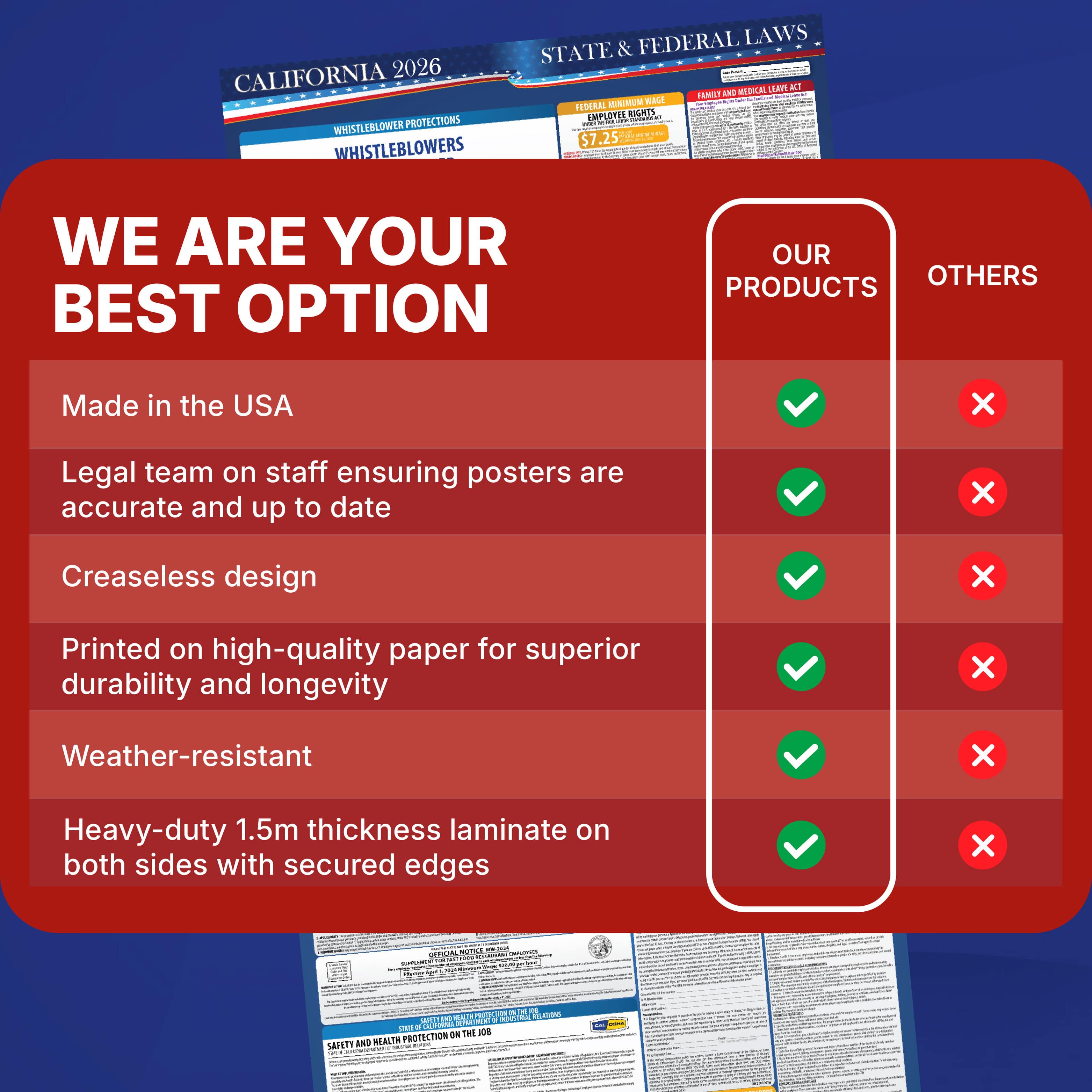 Ensure your business meets state, OSHA, and federal labor law requirements with our comprehensive labor law posters. Updated with the latest mandatory notices, our posters help companies avoid fines and ensure compliance with ease.