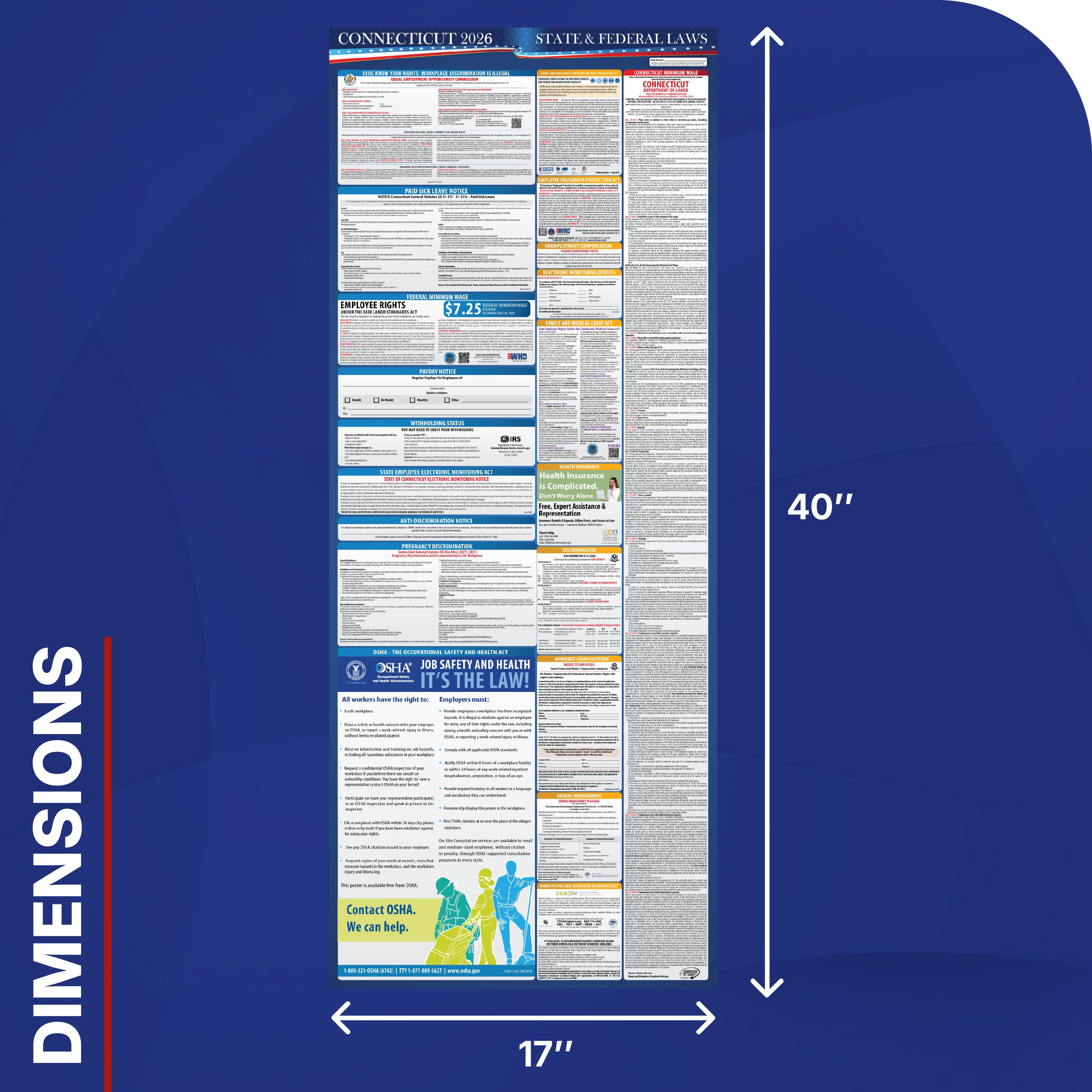 An All-in-One labor law poster that includes Federal, State, and OSHA-required labor laws printed on a 17x40" double-laminated heavy-duty sheet. Designed to ensure businesses comply with mandatory state and federal labor law requirements, this high-quality, full-color poster includes all essential postings as well as state-specific regulations tailored to your location. Its professional design ensures the information is easy to read and understand, while the durable materials make it suitable for long-term use in employee areas like break rooms or near time clocks. This product is continuously updated to reflect the latest legal changes, providing a simple and effective way for employers to meet compliance obligations and keep employees informed about their rights and responsibilities.