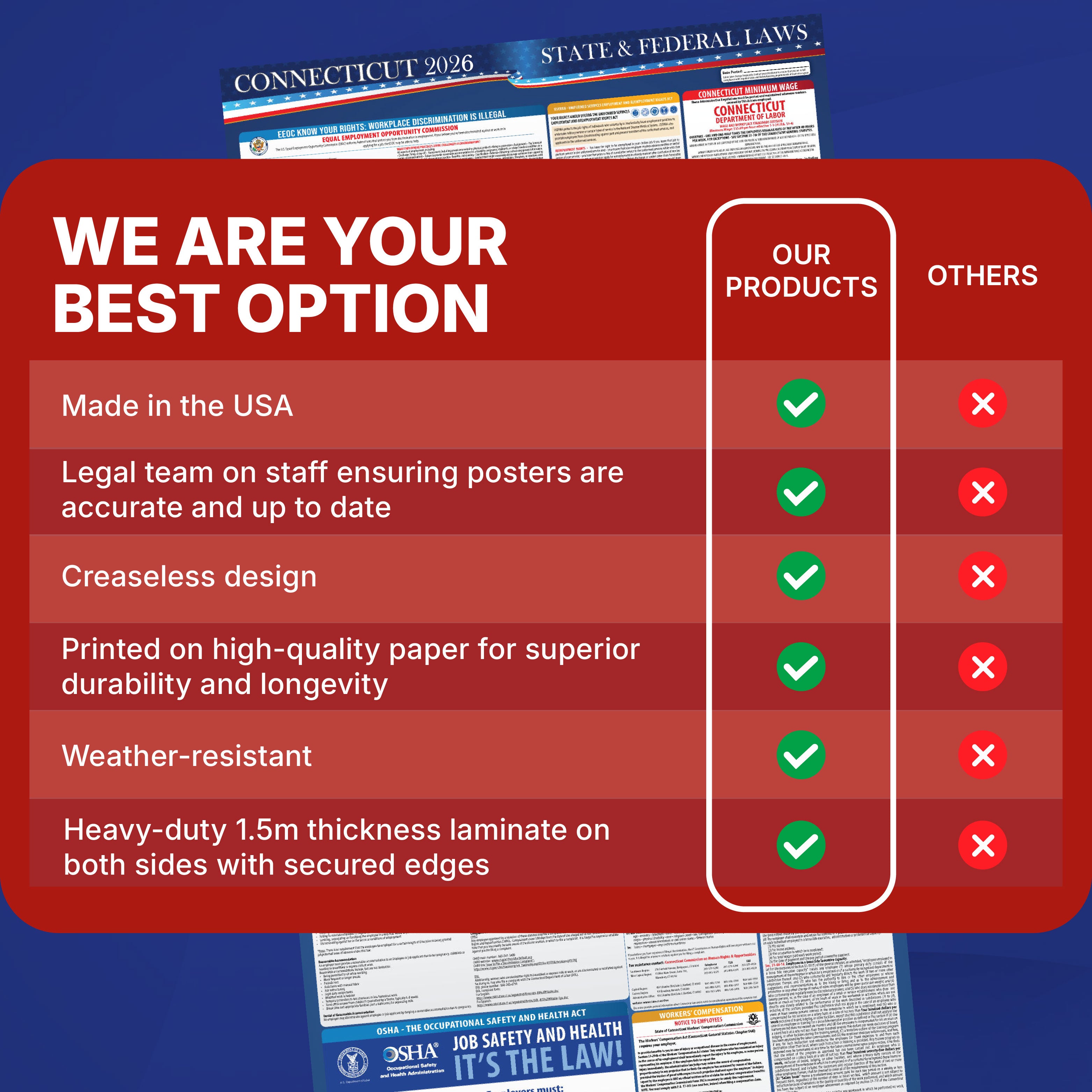 Regulations change throughout the year, and staying compliant can be challenging. Our posters are always up to date, ensuring you meet every requirement, from federal to state-specific updates. Let us handle compliance while you focus on your business.