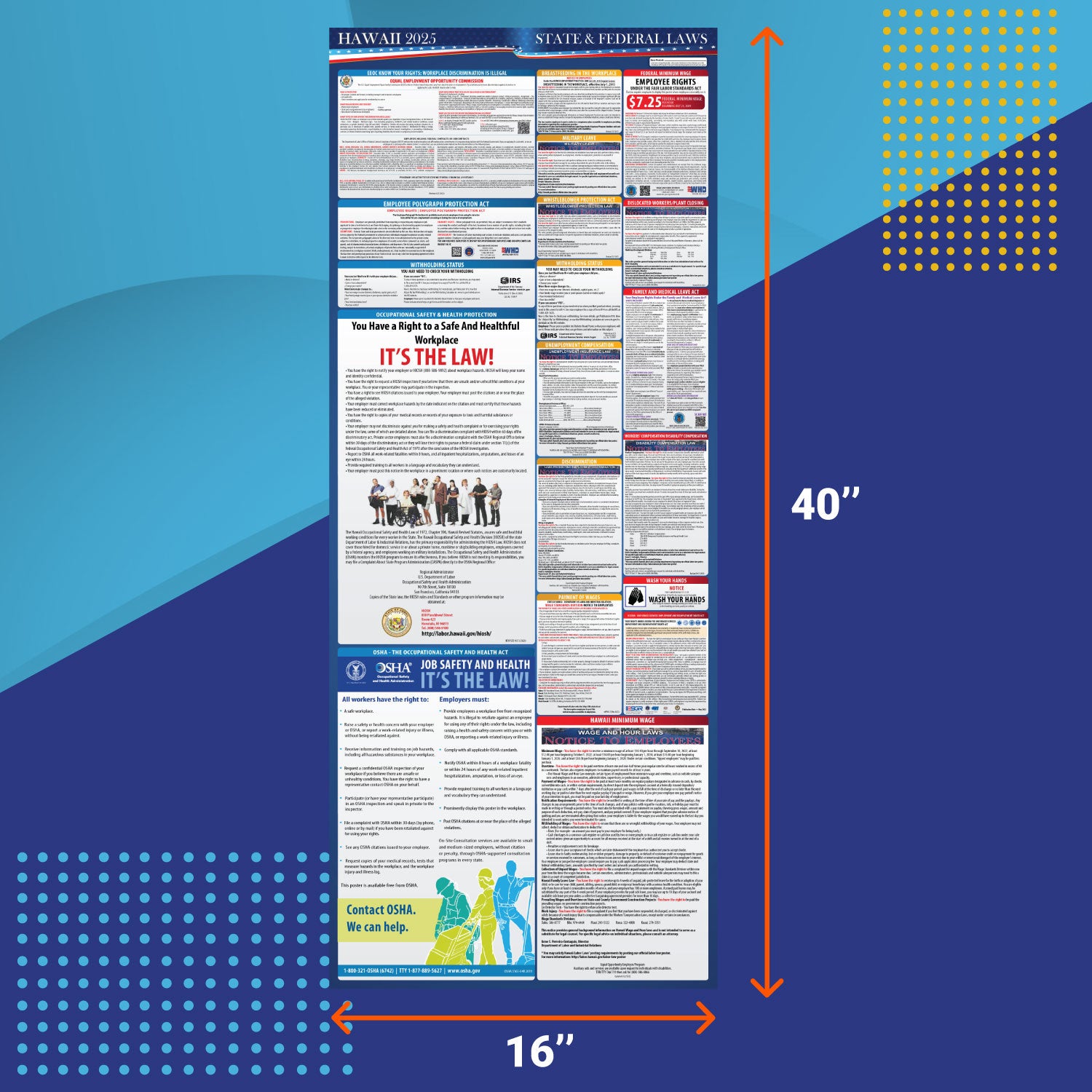 An All-in-One labor law poster that includes Federal, State, and OSHA-required labor laws printed on a 16x40" double-laminated heavy-duty sheet. Designed to ensure businesses comply with mandatory state and federal labor law requirements, this high-quality, full-color poster includes all essential postings as well as state-specific regulations tailored to your location. Its professional design ensures the information is easy to read and understand, while the durable materials make it suitable for long-term use in employee areas like break rooms or near time clocks. This product is continuously updated to reflect the latest legal changes, providing a simple and effective way for employers to meet compliance obligations and keep employees informed about their rights and responsibilities.