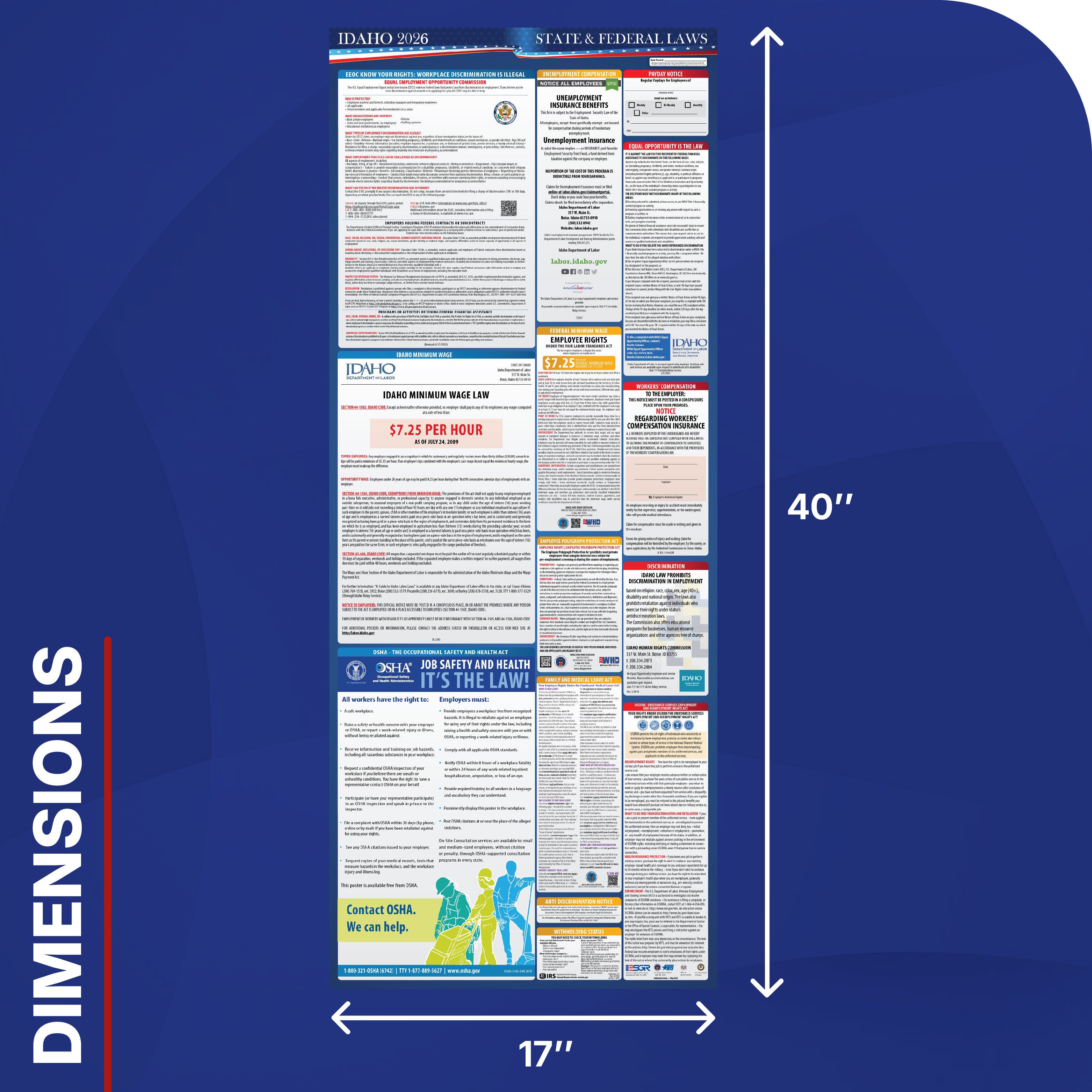 Ensure your Idaho workplace remains fully compliant and protected with the Idaho 2026 State & Federal Labor Law Poster, a comprehensive, one-sheet solution that consolidates all required federal, state and OSHA labour law notices—making it the ideal choice for employers who want a streamlined compliance display.