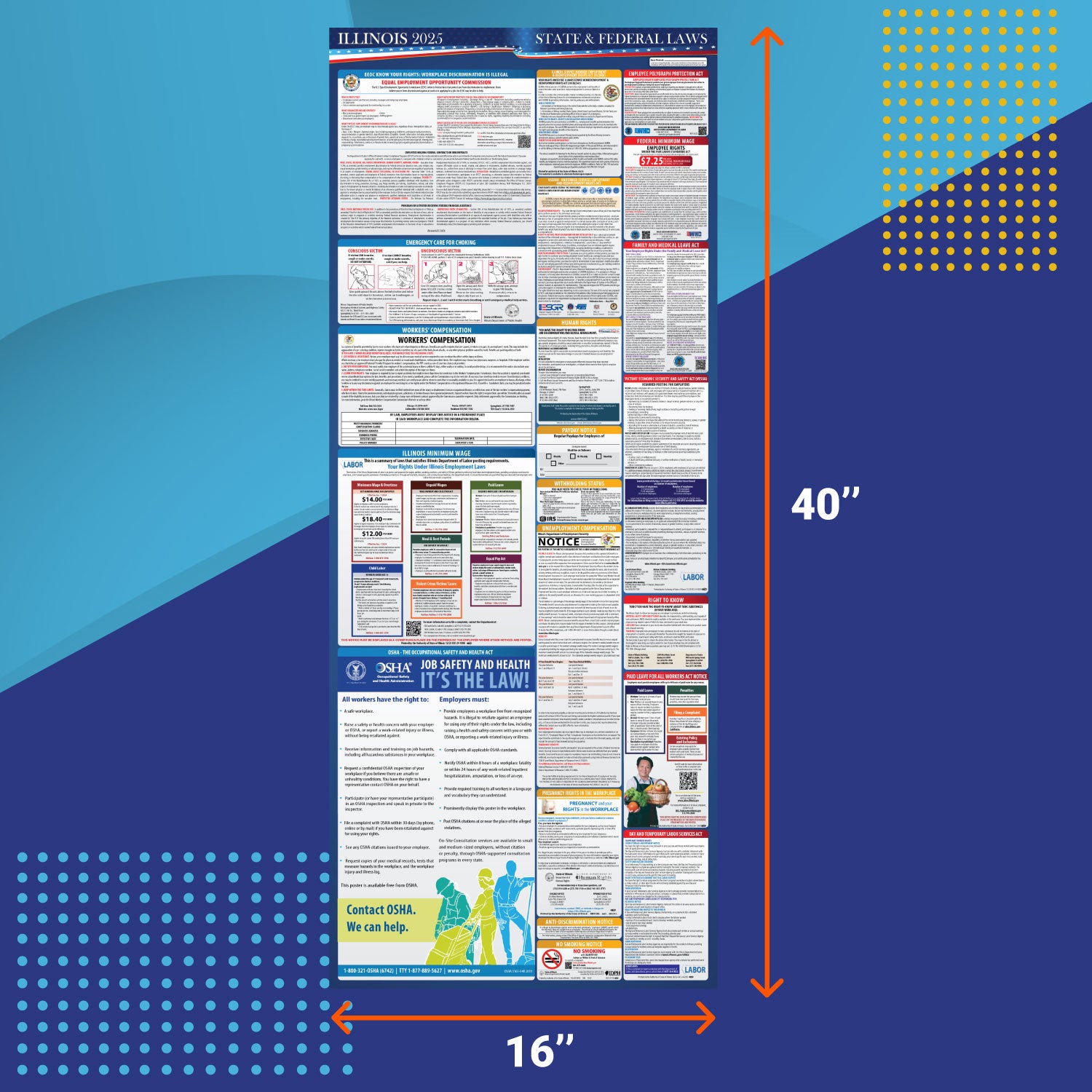 An All-in-One labor law poster that includes Federal, State, and OSHA-required labor laws printed on a 16x40" double-laminated heavy-duty sheet. Designed to ensure businesses comply with mandatory state and federal labor law requirements, this high-quality, full-color poster includes all essential postings as well as state-specific regulations tailored to your location. Its professional design ensures the information is easy to read and understand, while the durable materials make it suitable for long-term use in employee areas like break rooms or near time clocks. This product is continuously updated to reflect the latest legal changes, providing a simple and effective way for employers to meet compliance obligations and keep employees informed about their rights and responsibilities.