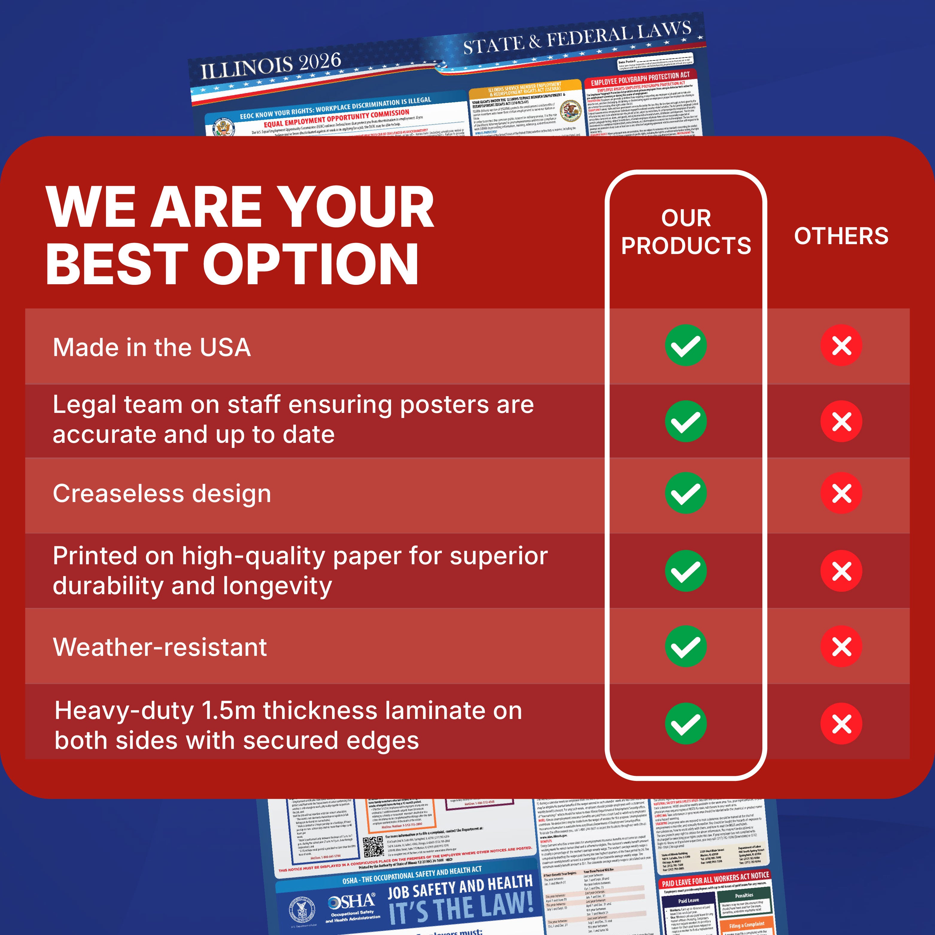 Regulations change throughout the year, and staying compliant can be challenging. Our posters are always up to date, ensuring you meet every requirement, from federal to state-specific updates. Let us handle compliance while you focus on your business.