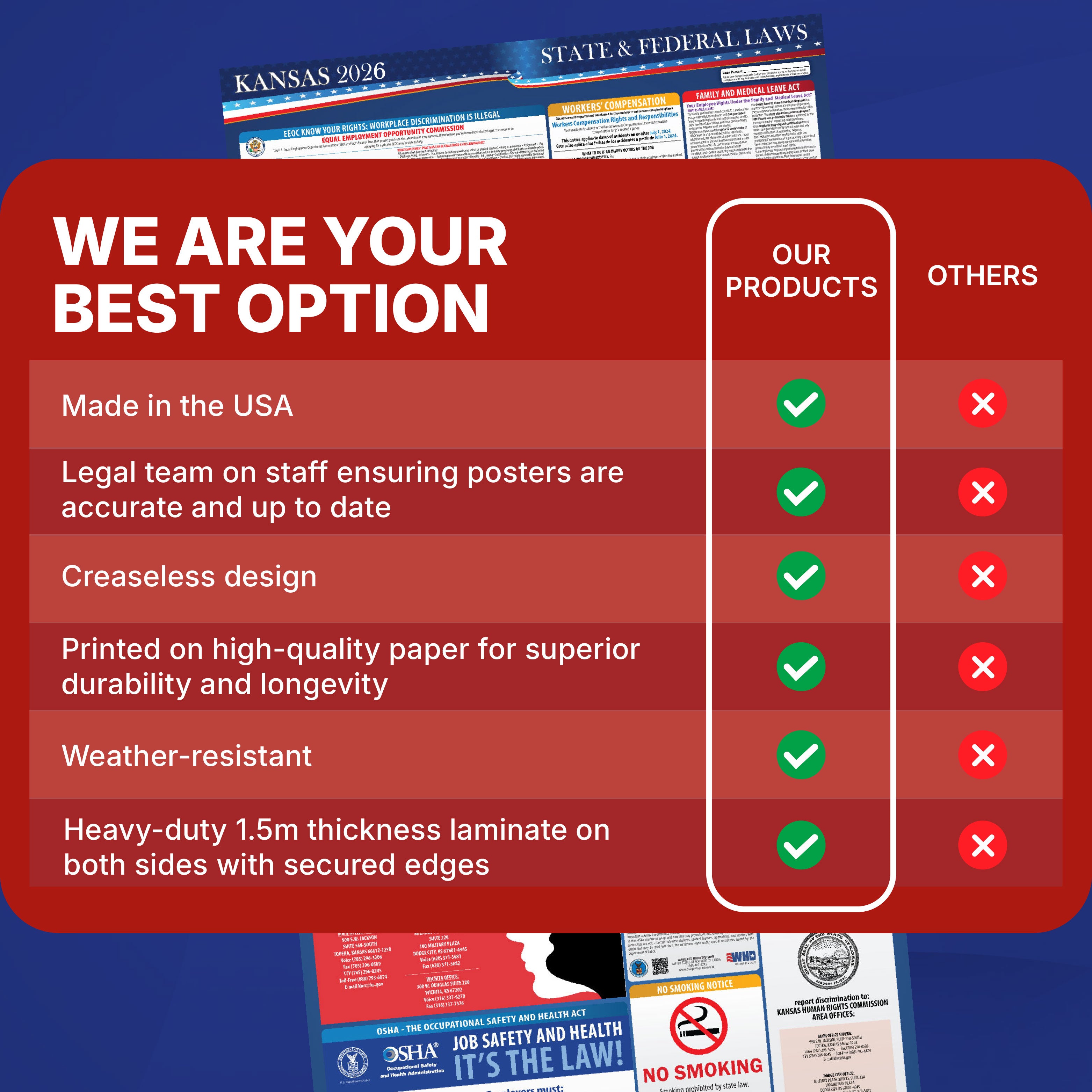 Regulations change throughout the year, and staying compliant can be challenging. Our posters are always up to date, ensuring you meet every requirement, from federal to state-specific updates. Let us handle compliance while you focus on your business.