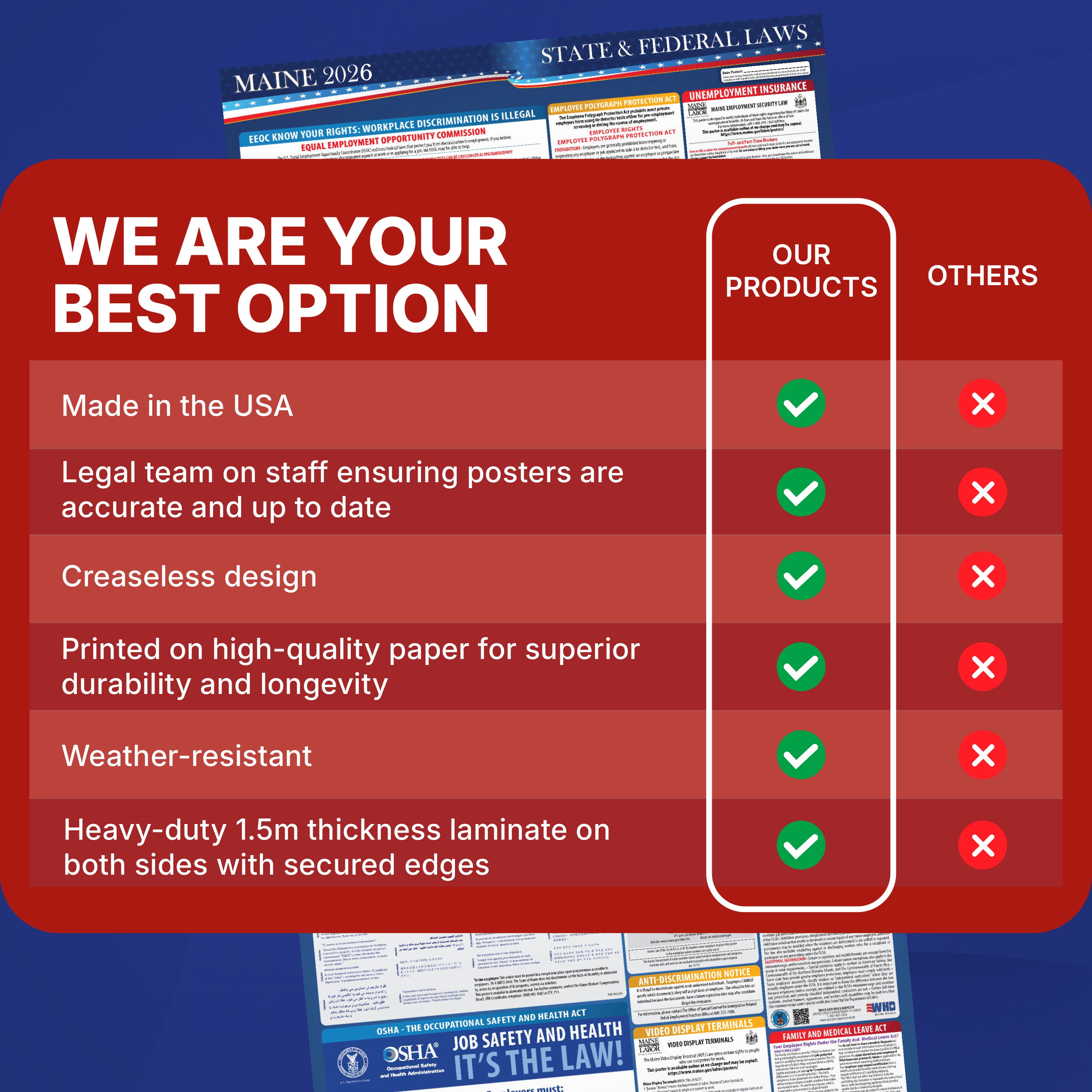 Regulations change throughout the year, and staying compliant can be challenging. Our posters are always up to date, ensuring you meet every requirement, from federal to state-specific updates. Let us handle compliance while you focus on your business.