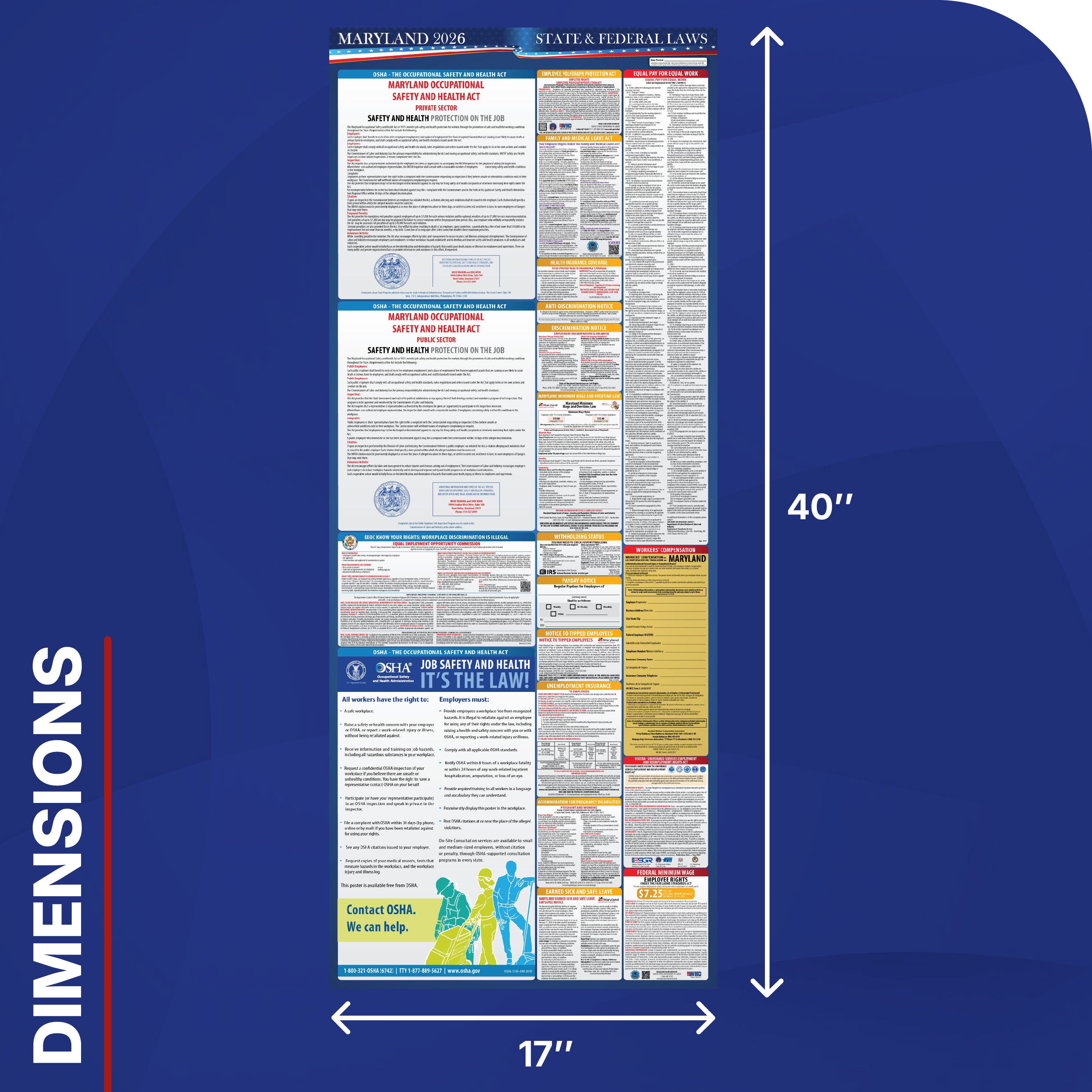 An All-in-One labor law poster that includes Federal, State, and OSHA-required labor laws printed on a 17x40" double-laminated heavy-duty sheet. Designed to ensure businesses comply with mandatory state and federal labor law requirements, this high-quality, full-color poster includes all essential postings as well as state-specific regulations tailored to your location. Its professional design ensures the information is easy to read and understand, while the durable materials make it suitable for long-term use in employee areas like break rooms or near time clocks. This product is continuously updated to reflect the latest legal changes, providing a simple and effective way for employers to meet compliance obligations and keep employees informed about their rights and responsibilities.