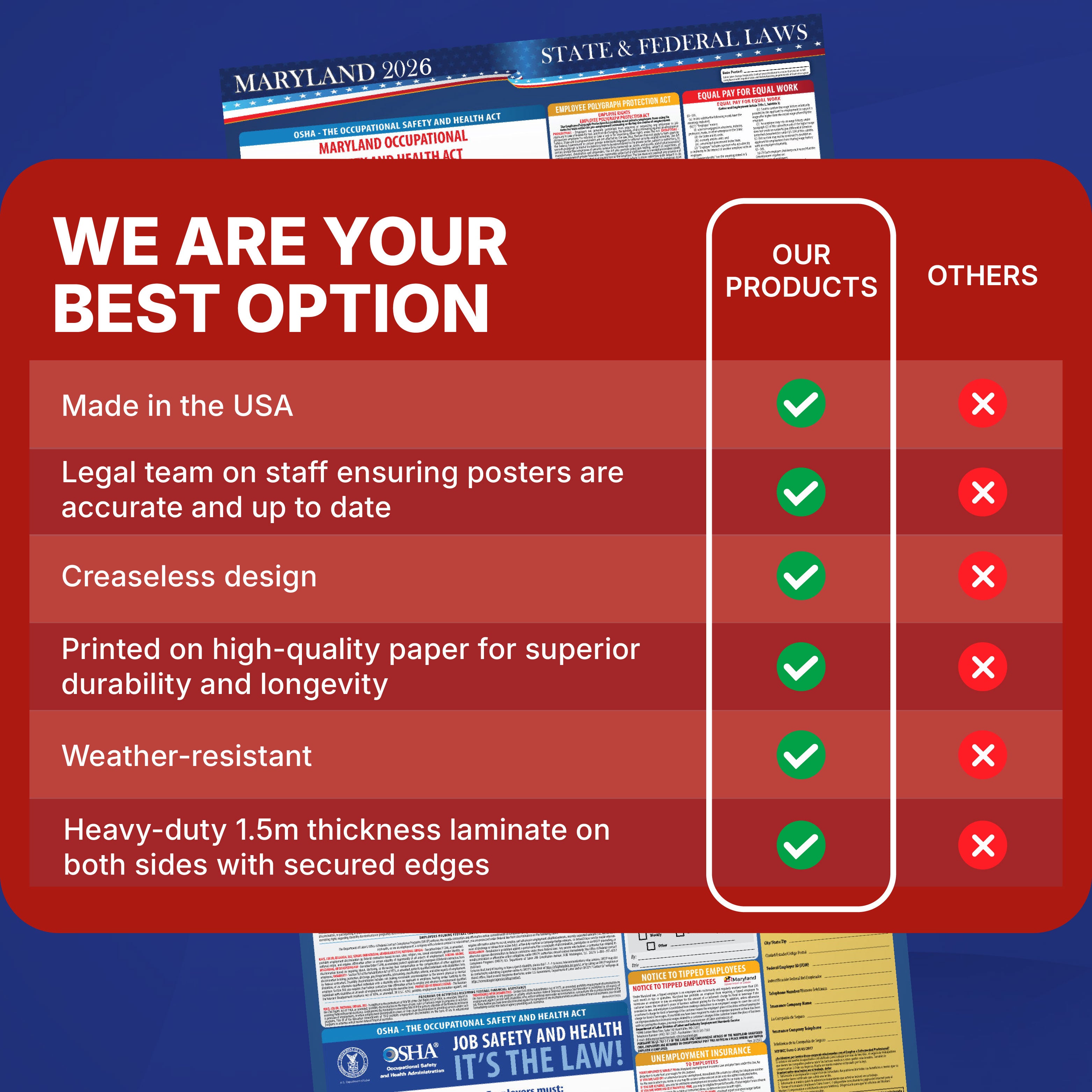Regulations change throughout the year, and staying compliant can be challenging. Our posters are always up to date, ensuring you meet every requirement, from federal to state-specific updates. Let us handle compliance while you focus on your business.
