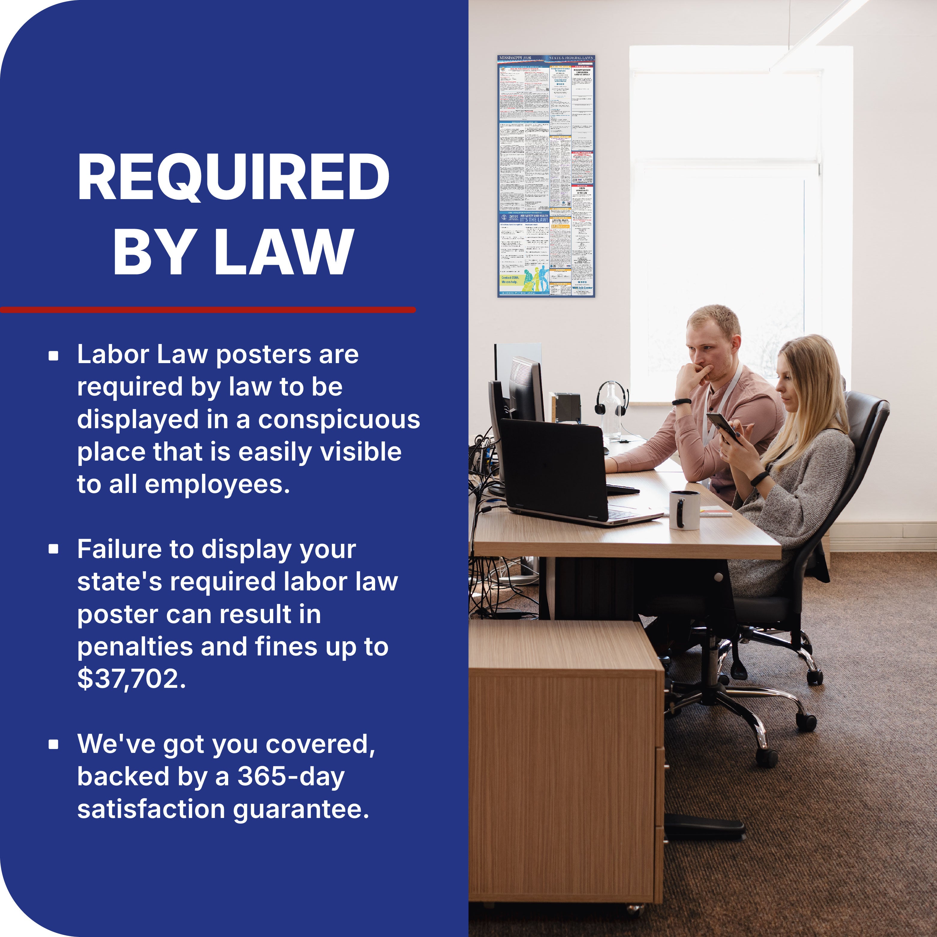 An All-in-One labor law poster that includes Federal, State, and OSHA-required labor laws printed on a 17x40" double-laminated heavy-duty sheet. Designed to ensure businesses comply with mandatory state and federal labor law requirements, this high-quality, full-color poster includes all essential postings as well as state-specific regulations tailored to your location. Its professional design ensures the information is easy to read and understand, while the durable materials make it suitable for long-term use in employee areas like break rooms or near time clocks. This product is continuously updated to reflect the latest legal changes, providing a simple and effective way for employers to meet compliance obligations and keep employees informed about their rights and responsibilities.