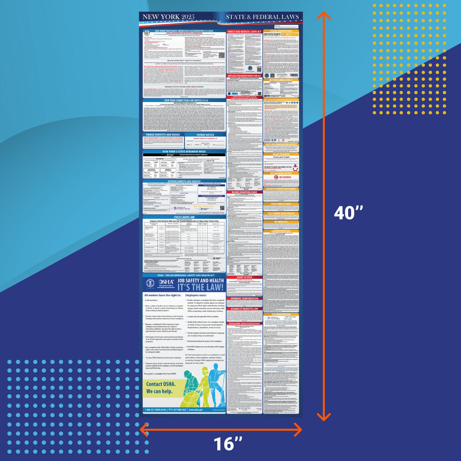 An all-in-one New York State labor law poster that includes Federal, State, and OSHA-required labor laws printed on a 16x40" double-laminated heavy-duty sheet. Designed to ensure businesses comply with mandatory state and federal labor law requirements, this high-quality, full-color poster includes all essential postings, as well as state-specific regulations tailored to your location.