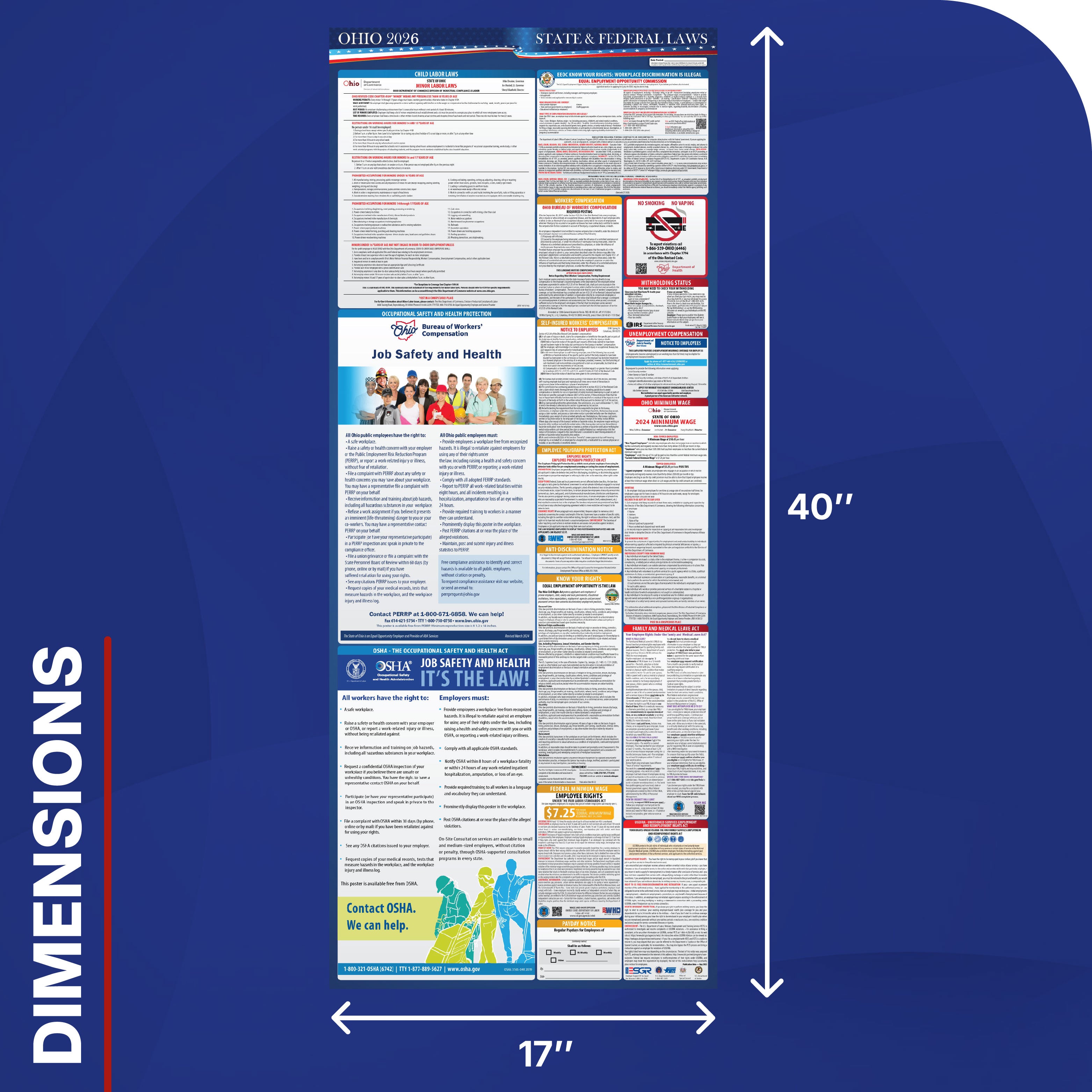 Ensure your business stays fully compliant with labour law requirements in Ohio by choosing the Ohio 2026 State & Federal Labor Law Poster. This comprehensive, all-in-one poster delivers the latest mandatory federal, state and OSHA notices—conveniently printed on one large, readable sheet—making it the ideal choice for Ohio employers who want to demonstrate workplace compliance with ease.