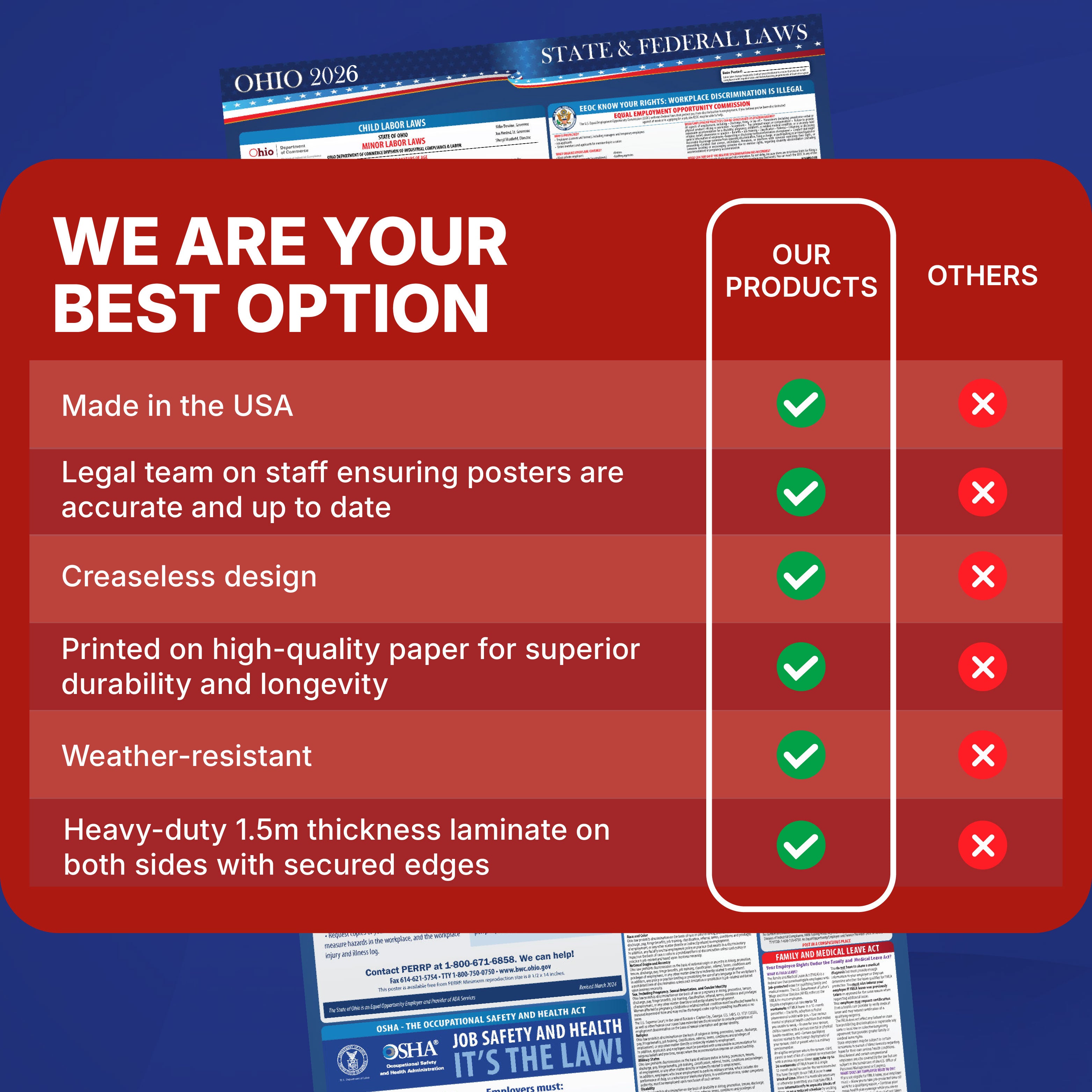 The Ohio 2026 labour law poster includes every required notice mandated by both federal and Ohio state labour regulations. From the federal minimum wage poster and the Family and Medical Leave Act (FMLA) to Ohio’s unemployment compensation rules, minimum wage requirements and child-labor laws, this poster covers it all. With regulatory updates issued multiple times per year, it’s essential to display a version that reflects the most current Ohio labour law changes. This poster is updated accordingly so your workplace remains compliant.