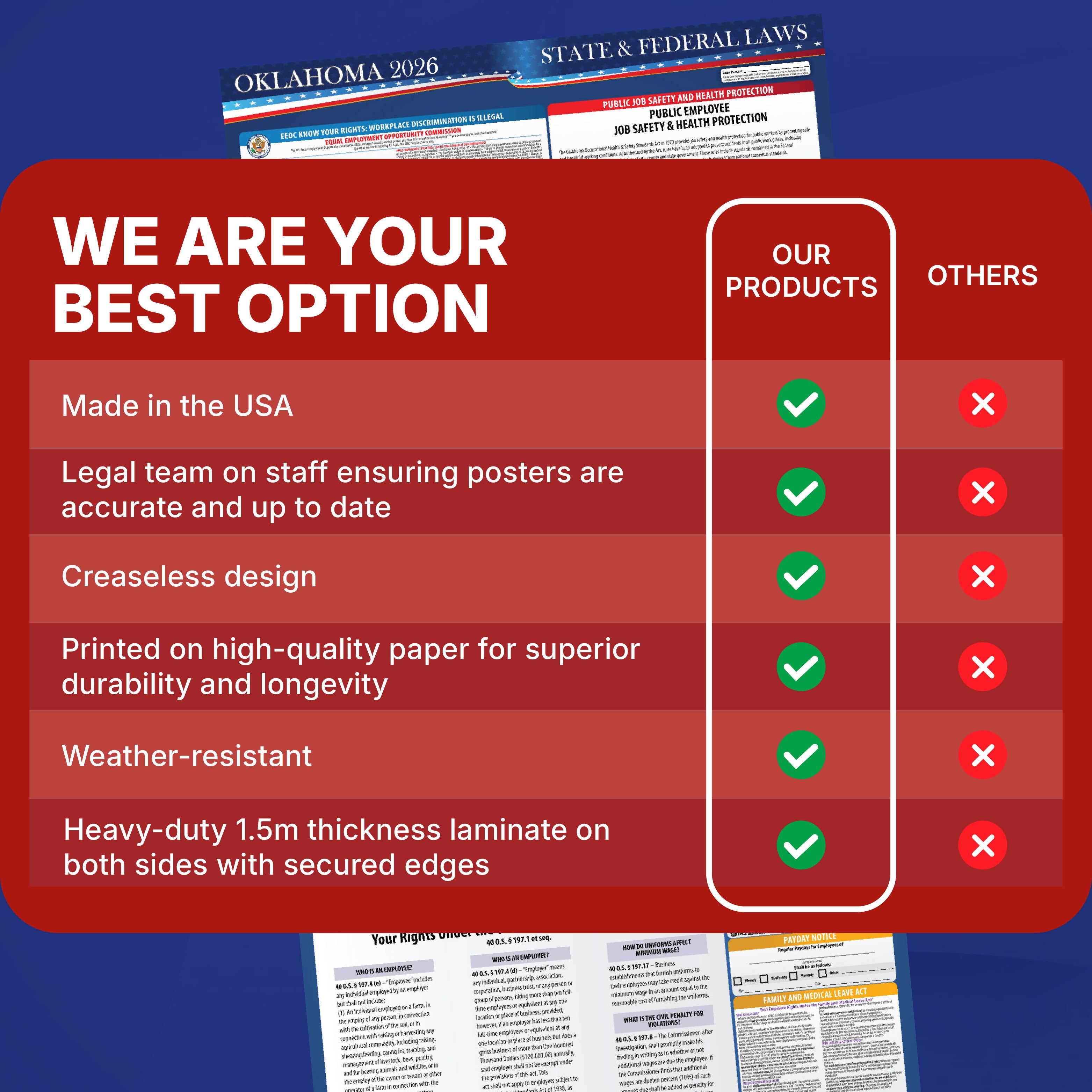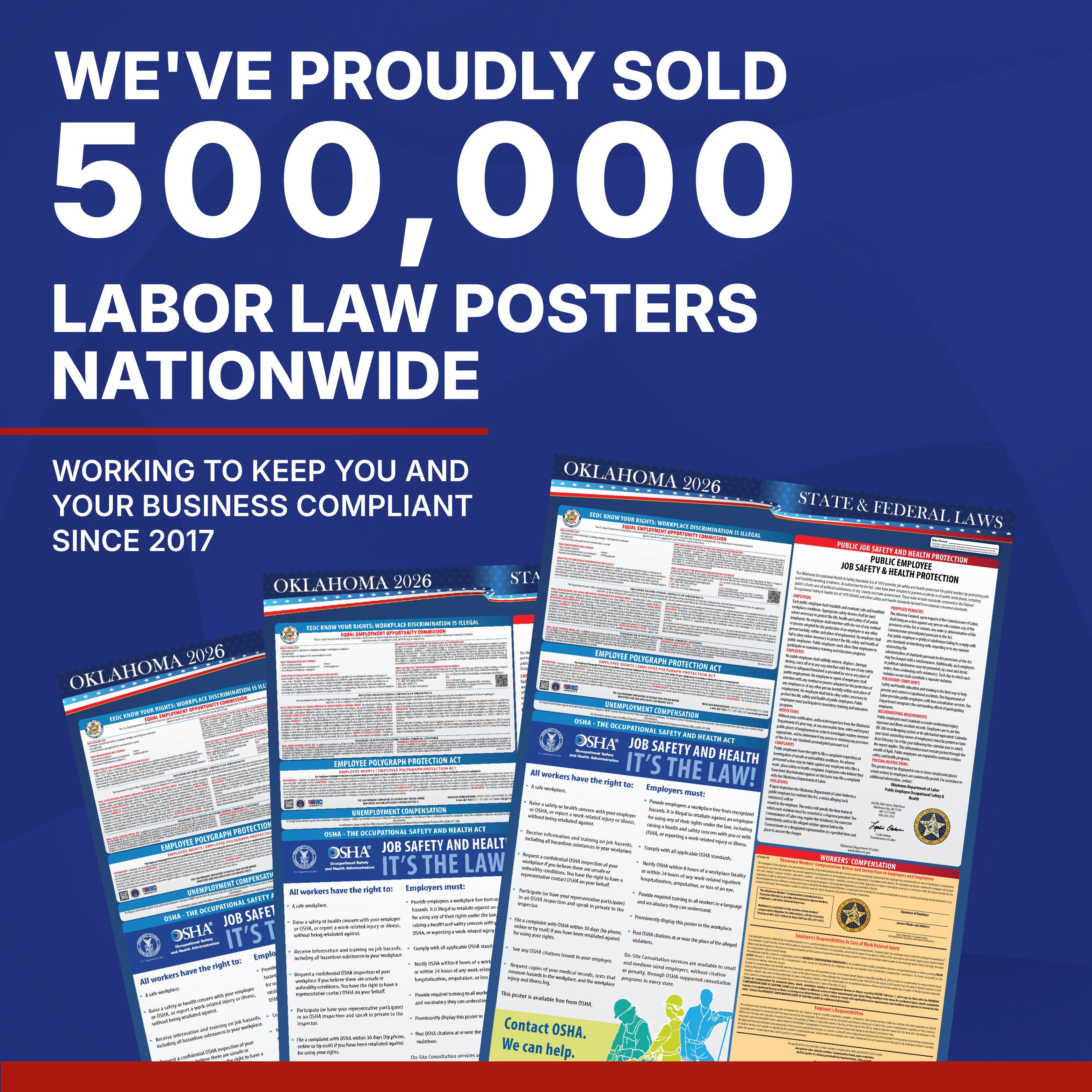 Don’t wait for a compliance audit or surprise change in labor law. Order your Oklahoma 2026 State & Federal Labor Law Poster today, display it confidently, and focus on what matters — running your business while staying fully compliant. Make your workplace posting simple, effective and up to date.