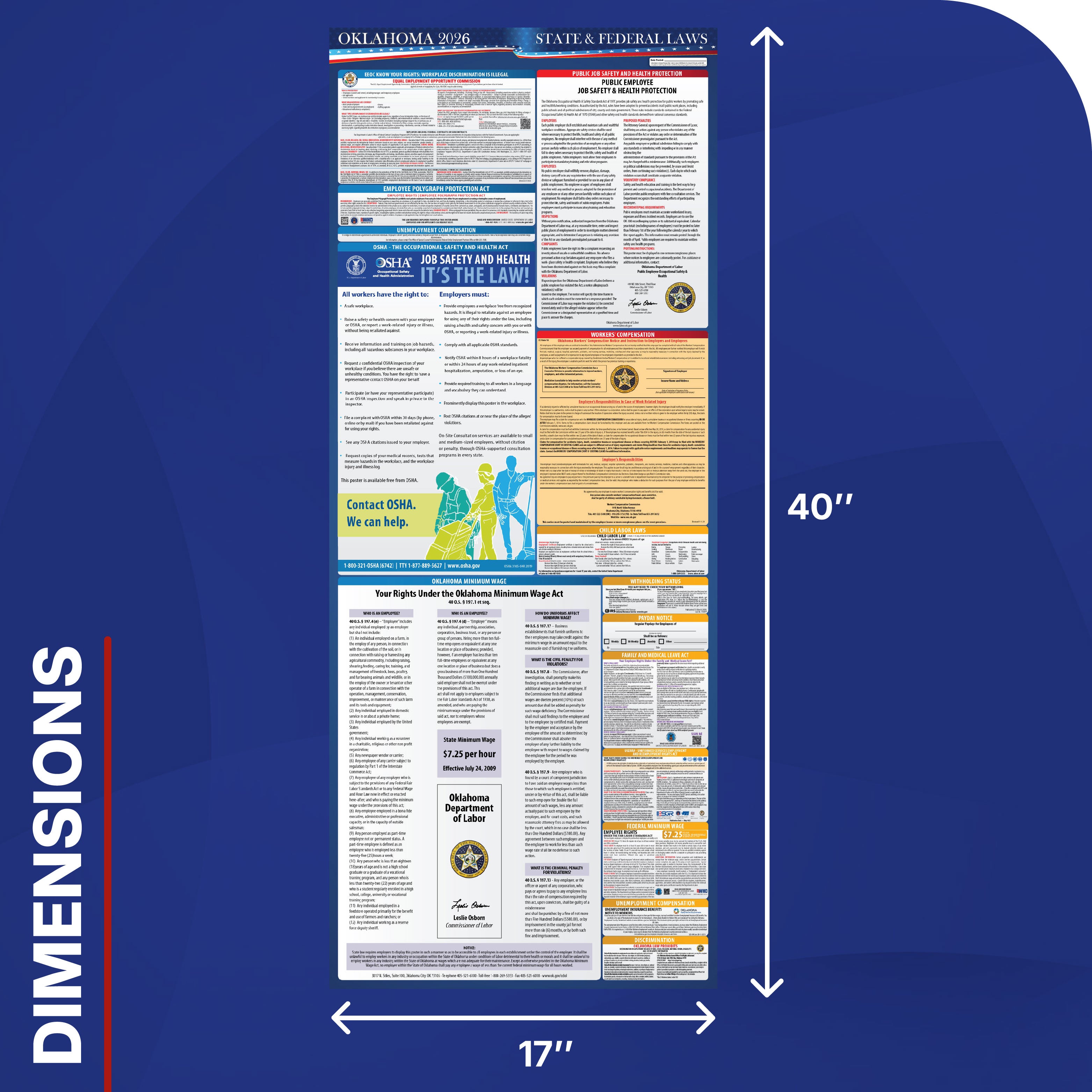 Ensure your workplace is fully compliant with the latest Oklahoma 2026 labor law poster, covering both state and federal requirements in one convenient display. As an employer, it’s essential to have the correct labor law poster displayed prominently for employees, and failure to do so can result in costly fines and compliance risks. With our updated Oklahoma state & federal labor law poster – 2026 edition, you get peace of mind knowing you’re covered with the most current notices.