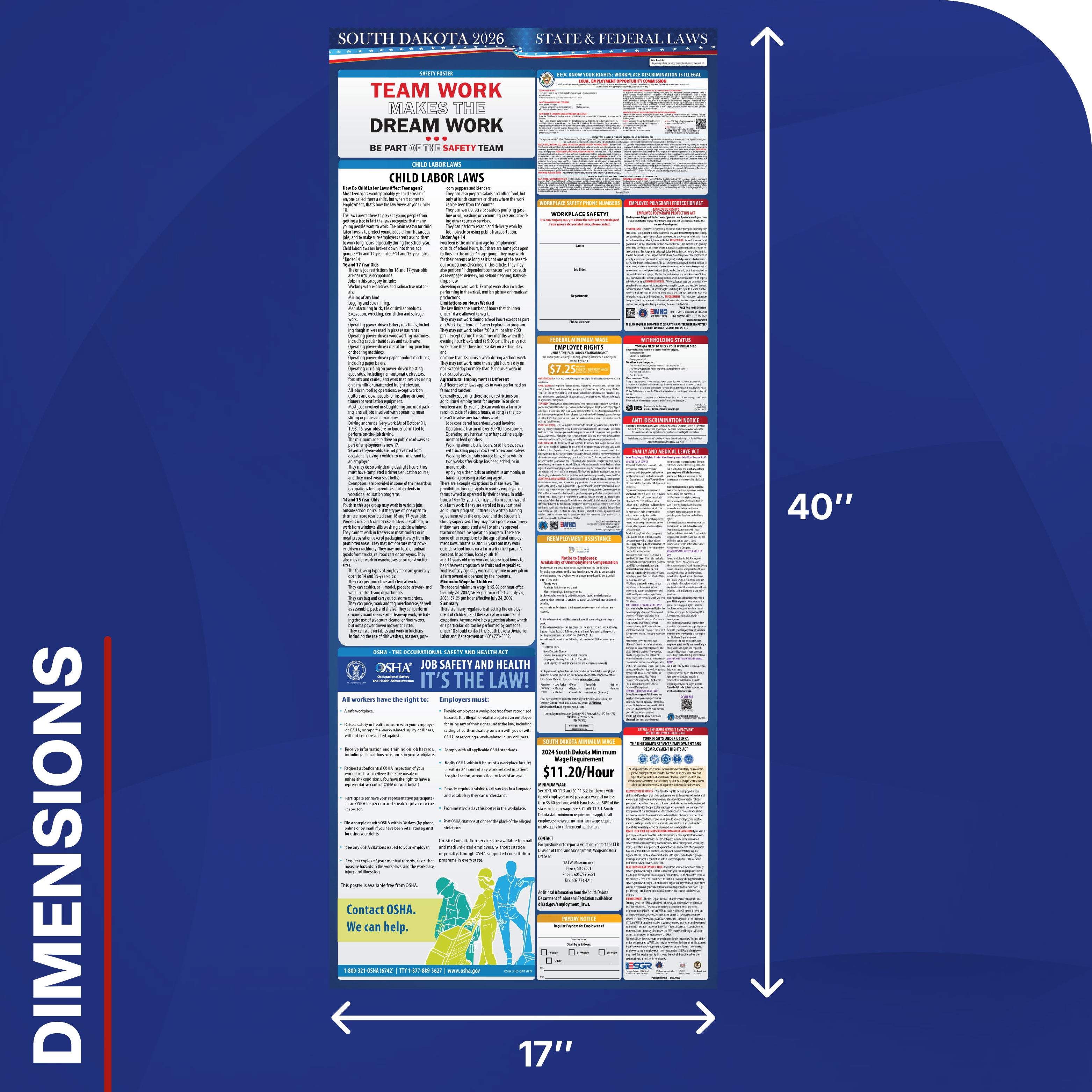 Ensure your business meets all state and federal labor law requirements with the South Dakota 2026 State Labor Law Poster. This all-in-one poster consolidates essential notices, including: